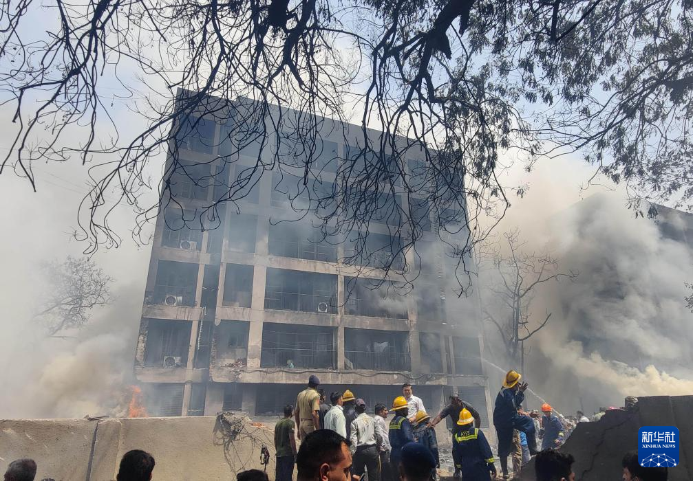 6月12日,消防員在印度古吉拉特邦艾哈邁達(dá)巴德附近墜機(jī)現(xiàn)場滅火。新華社/美聯(lián)