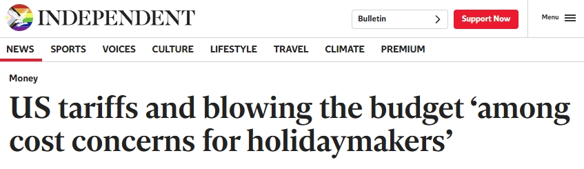 此外,美國(guó)關(guān)稅政策的影響已外溢至國(guó)際層面,甚至影響了外國(guó)民眾的出行計(jì)劃。英國(guó)《獨(dú)立報(bào)》援引的一項(xiàng)報(bào)告顯示,78%的受訪者擔(dān)心美國(guó)貿(mào)易關(guān)稅可能對(duì)國(guó)外目的地的價(jià)格造成影響;53%的人計(jì)劃避開(kāi)那些他們認(rèn)為關(guān)稅可能會(huì)推高國(guó)外目的地的物價(jià);77%的人表示,匯率是他們的一大擔(dān)憂。