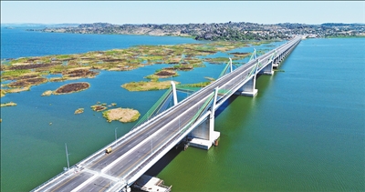 隨著坦桑尼亞總統(tǒng)哈桑揮動國旗,示意車輛可以通行,等待駛過馬古富力大橋的首批車輛紛紛啟動。身穿當(dāng)?shù)貍鹘y(tǒng)服飾的民眾載歌載舞,現(xiàn)場歡呼聲、歌聲、掌聲交織在一起……日前,由中國土木與中鐵十五局聯(lián)合承建的非洲最長矮塔斜拉橋——坦桑尼亞馬古富力大橋(見圖,中國土木供圖)建成通車。橫跨維多利亞湖的馬古富力大橋如一道飛虹連通兩岸,成為中非友誼新地標(biāo)。