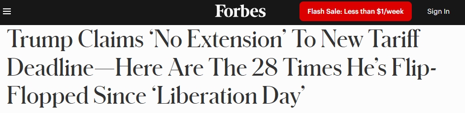 對于此次關稅調(diào)整,《福布斯》雜志網(wǎng)站7日報道指出,從今年2月7日首次公開提及對他國進口商品征收全面關稅,到強調(diào)“2025年8月1日這一日期不會有任何延長”的這五個月里,特朗普政府在關稅問題上的態(tài)度“翻轉(zhuǎn)”了大約28次。