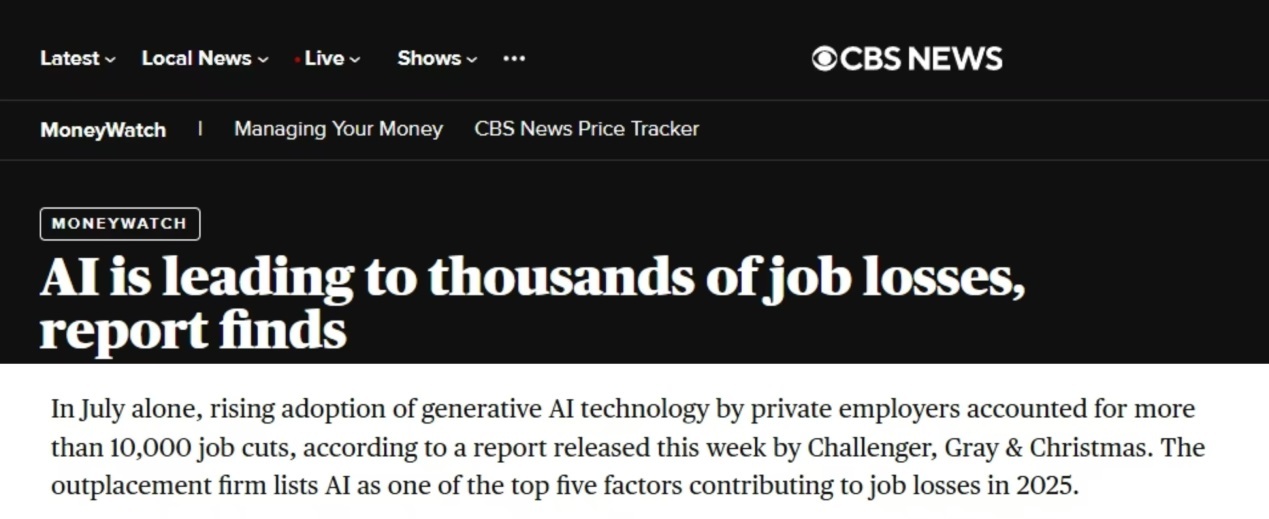 美國哥倫比亞廣播公司刊發(fā)的一篇報道認(rèn)為,人工智能(AI)技術(shù)已成為美國企業(yè)今年崗位流失的五大主因之一。報道說,自2023年以來,超2.7萬個崗位直接因AI興起被取代,僅今年7月,美國私營企業(yè)因加速采用AI技術(shù),已裁撤超1萬個工作崗位。