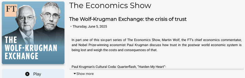 在美國關稅政策再成焦點之際,諾貝爾經(jīng)濟學獎得主保羅·克魯格曼(Paul Krugman)近日接受英國《金融時報》播客節(jié)目邀請,與《金融時報》首席經(jīng)濟評論員馬丁·沃爾夫(Martin Wolf)展開對話,制作推出六期特別節(jié)目《沃爾夫-克魯格曼對話》,討論了美國在特朗普政府政策下面臨的信任危機和治理崩潰的風險,特別對特朗普政府的貿易與關稅政策進行了罕見的系統(tǒng)性批評。
