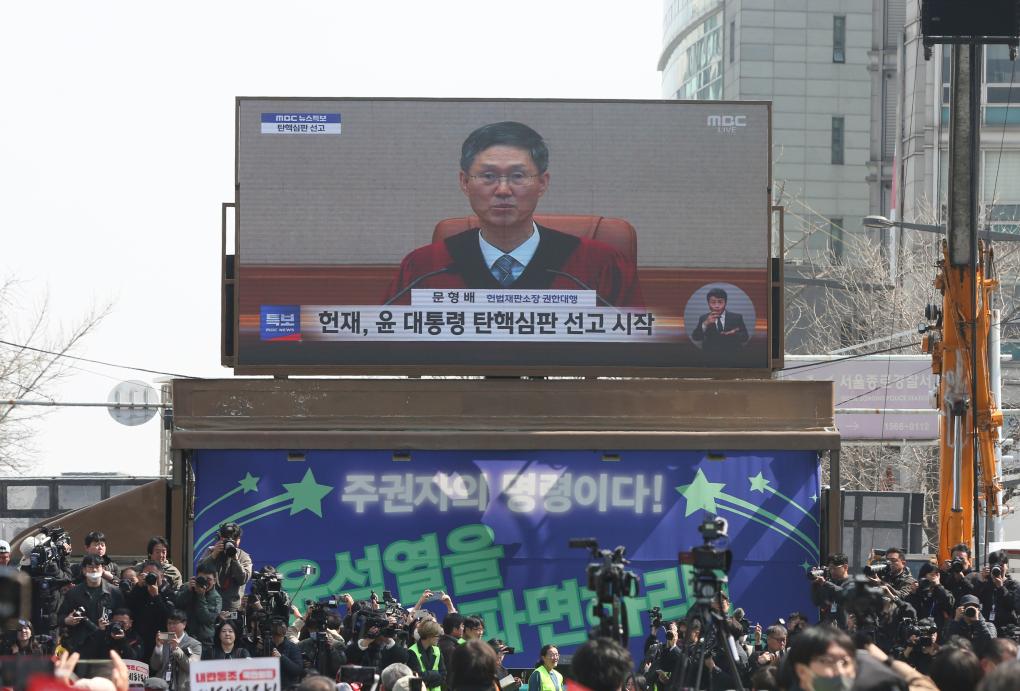 4月4日,民眾在韓國(guó)首都首爾的韓國(guó)憲法法院附近觀看尹錫悅彈劾案宣判過(guò)程的電視直播。新華社記者姚琪琳攝