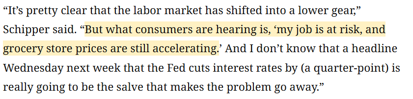美國(guó)圣托馬斯大學(xué)副教授泰勒·施普爾 (Tyler Schipper)認(rèn)為 :對(duì)普通消費(fèi)者來(lái)說,耳邊最真切的聲音是“我的工作隨時(shí)可能保不住”,是“超市里的食品雜貨價(jià)格還在一個(gè)勁往上漲”。所以我實(shí)在不確定,下周“美聯(lián)儲(chǔ)降息”的頭條新聞,真能成為化解這些現(xiàn)實(shí)困境的良藥嗎?