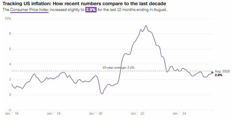 美國(guó)勞工統(tǒng)計(jì)局最新數(shù)據(jù)顯示,2025年8月消費(fèi)者價(jià)格指數(shù)(CPI)環(huán)比上漲0.4%,年通脹率攀升至2.9%,不僅創(chuàng)下今年1月以來(lái)的最高水平,而且增速超過7月的2.7%。