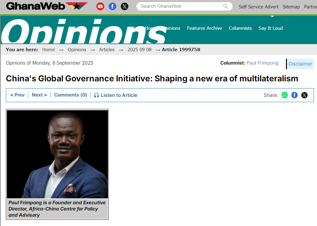 加納新聞網(wǎng)站“Ghana Web”9月8日刊發(fā)加納非中政策咨詢中心執(zhí)行主任保羅·弗林蓬的署名文章《中國全球治理倡議:塑造多邊主義新時(shí)代》,對中國提出的全球治理倡議予以高度評價(jià)。