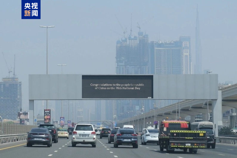 △迪拜市中心公路大屏上播放著“祝賀中華人民共和國成立76周年”的賀詞