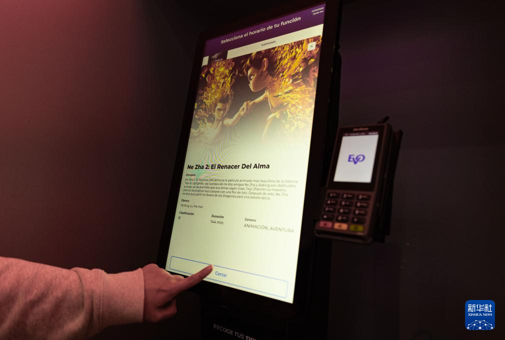 9月25日,在墨西哥首都墨西哥城的一家電影院,觀眾在自動售票機上購買《哪吒2》電影票。新華社記者 李夢馨 攝
