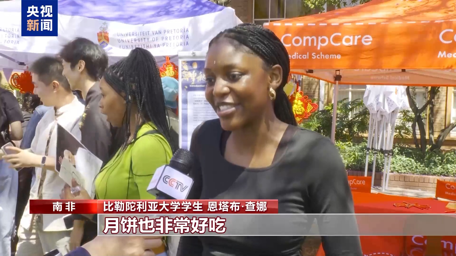 南非比勒陀利亞大學(xué)學(xué)生 恩塔布·查娜:中秋節(jié)讓我覺得很溫馨,這是我第一次看到中國(guó)人穿漢服。我品嘗了中國(guó)茶,一切都很棒,月餅也非常好吃。