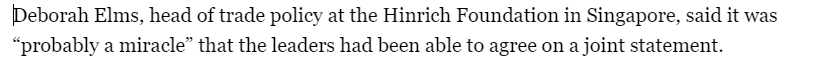 半島電視臺也關(guān)注了此次峰會,報道援引新加坡欣里奇基金會貿(mào)易政策負責人黛博拉 埃爾姆斯的話說,各成員領(lǐng)導人能夠就聯(lián)合聲明達成一致是“了不起的事情”。他說,鑒于亞太經(jīng)合組織經(jīng)濟體的不同立場,要將任何達成一致的措辭寫入文件都是一項“充滿挑戰(zhàn)的工作”。