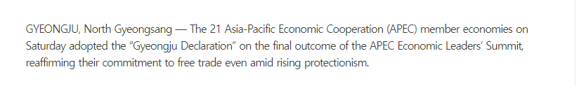 韓國《中央日報》報道稱,《慶州宣言》反映出此次APEC領(lǐng)導人峰會的最終成果,并重申了在保護主義抬頭 的背景下,各成員領(lǐng)導人對自由貿(mào)易的承諾。