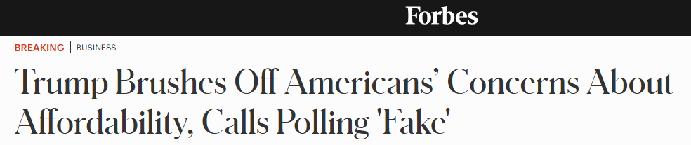 福布斯新聞網(wǎng)站報道稱,本月早些時候的調(diào)查顯示,超過四分之三的美國人對個人財務(wù)狀況感到憂慮,而政府卻質(zhì)疑民調(diào)的真實性,稱其為“虛假信息”。然而,多數(shù)民眾正經(jīng)歷的是物價上漲帶來的支出增加。盡管特朗普政府宣稱“生活成本已大幅下降”,但電費、家具、電子產(chǎn)品及食品雜貨等價格自其就職以來便普遍上漲。