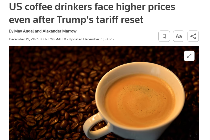 報(bào)道提到,今年11月,在民主黨贏得新澤西、紐約和弗吉尼亞等州的選舉勝利、選民對(duì)食品價(jià)格不滿情緒上升的背景下,本屆美國政府撤銷了對(duì)咖啡等200多種“難以在美國本土生產(chǎn)”的食品征收10%至41%所謂“對(duì)等關(guān)稅”。
