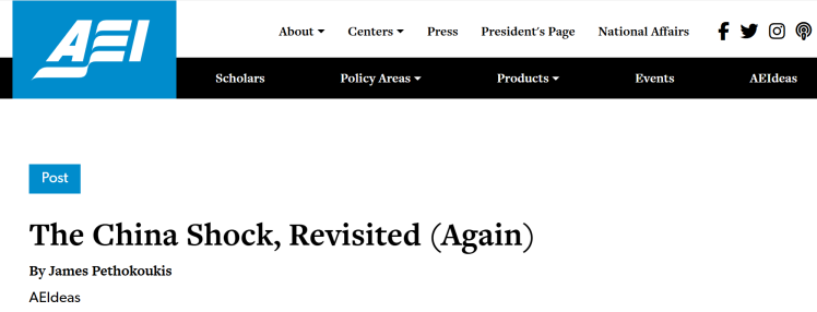 當(dāng)前全球經(jīng)濟(jì)復(fù)蘇乏力、貿(mào)易保護(hù)主義抬頭,部分西方政客與媒體頻繁炒作“中國沖擊論”,企圖將損人不利己的“關(guān)稅大棒”合理化。美國知名保守派智庫美國企業(yè)公共政策研究所(American Enterprise Institute for Public Policy Research)高級研究員詹姆斯·佩索科基斯(James Pethokoukis)近日發(fā)文稱,基于大量數(shù)據(jù)分析與案例研究,“中國沖擊論”站不住腳,中國融入全球經(jīng)濟(jì)促進(jìn)了美國經(jīng)濟(jì)增長,實際上顯著提高了美國人民的生活品質(zhì)。