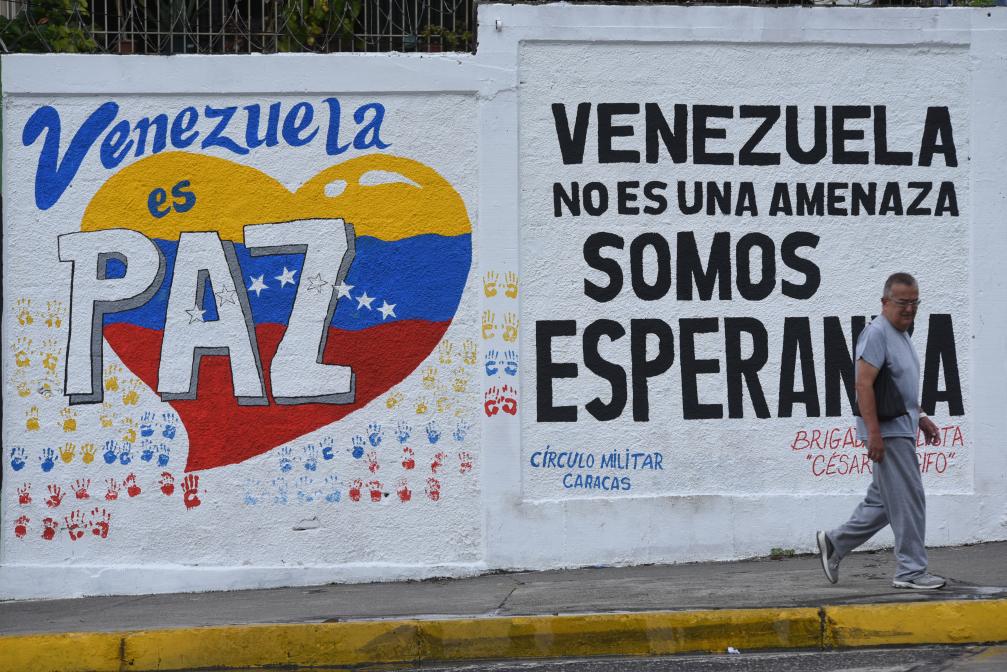 2025年9月22日,在委內(nèi)瑞拉首都加拉加斯,行人從街頭的宣傳標(biāo)語(yǔ)前走過(guò)。標(biāo)語(yǔ)上寫著“委內(nèi)瑞拉是和平國(guó)度”“委內(nèi)瑞拉不是威脅,而是希望”。新華社發(fā)(馬科斯·薩爾加多攝)