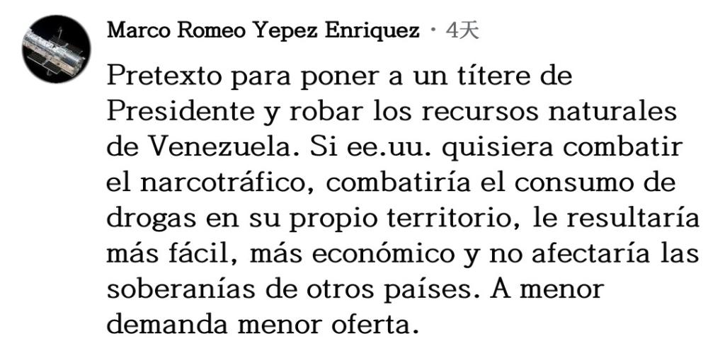 網(wǎng)友馬爾科·耶佩斯直言不諱:“所有一切不過(guò)是美國(guó)安插傀儡以掠奪委內(nèi)瑞拉自然資源的借口罷了。如果美國(guó)真想打擊販毒,就應(yīng)該去打擊自己領(lǐng)土上的毒品消費(fèi),這樣更簡(jiǎn)單、更經(jīng)濟(jì),也不會(huì)影響其他國(guó)家的主權(quán),需求減少供應(yīng)自然也會(huì)下降?!?/p>