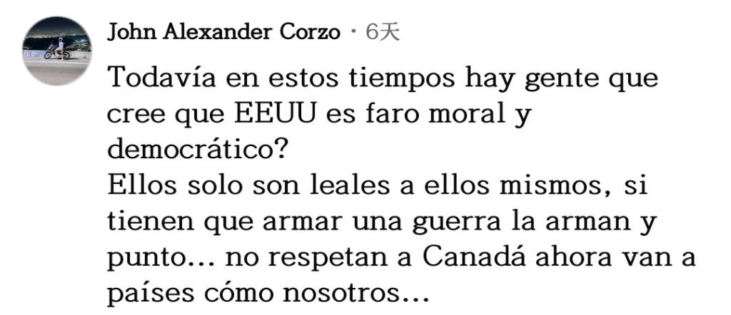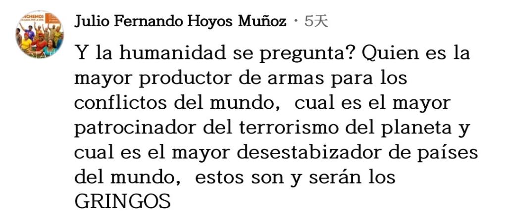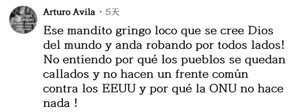 網(wǎng)友阿爾圖羅·阿維拉表達(dá)不解:“美國(guó)自以為是世界之神,到處掠奪!我不明白為什么各國(guó)人民依然保持沉默,而不是組成一個(gè)共同陣線對(duì)抗美國(guó)?!?/p>
