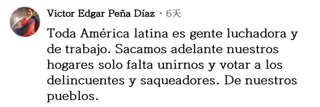 網(wǎng)友維克托·培尼亞留言說(shuō):“所有拉美人民都是勞動(dòng)者和奮斗者,我們靠自己的努力養(yǎng)家糊口。現(xiàn)在只差團(tuán)結(jié)起來(lái),把那些掠奪我們的罪犯和強(qiáng)盜趕跑?!?/p>