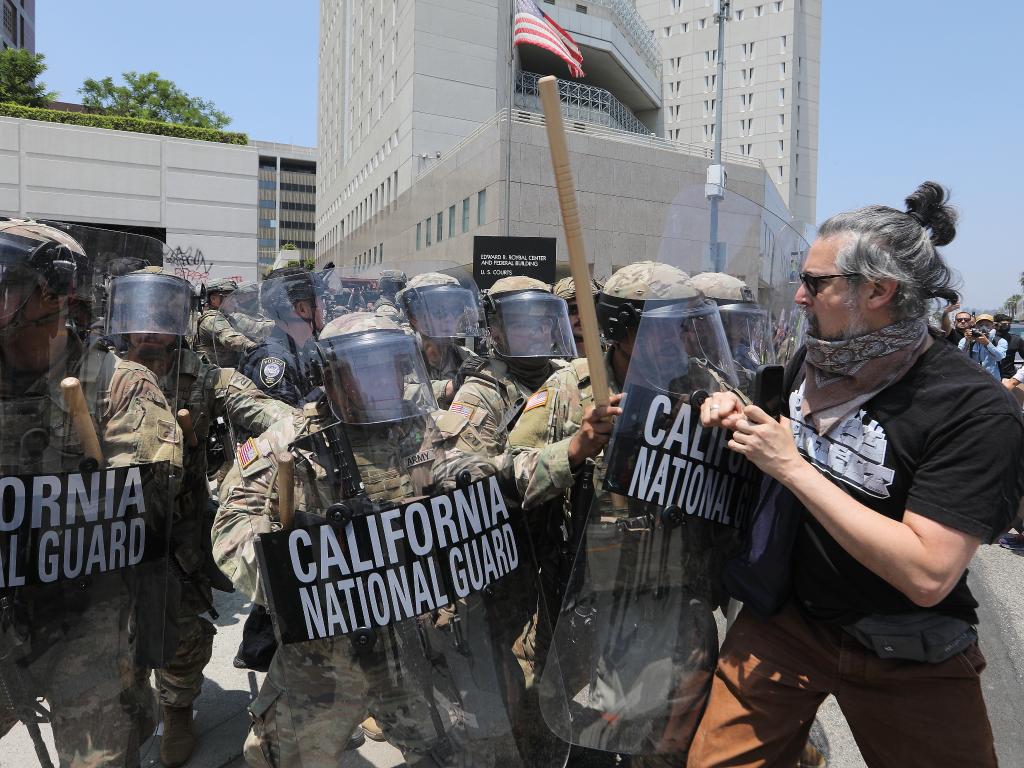 2025年6月8日,在美國加利福尼亞州洛杉磯市中心的聯(lián)邦執(zhí)法機(jī)構(gòu)門前,抗議者與國民警衛(wèi)隊人員發(fā)生沖突。新華社發(fā)(邱晨攝)