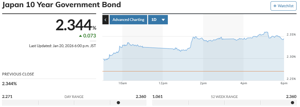1月20日,日本長(zhǎng)期國(guó)債在東京債券市場(chǎng)繼續(xù)遭到拋售,導(dǎo)致收益率不斷上揚(yáng)。當(dāng)天,作為日本長(zhǎng)期利率指標(biāo)的10年期日本國(guó)債收益率一度上升至2.330%,為1999年2月以來(lái)的最高水平。這一市場(chǎng)異動(dòng)恰逢日本政局進(jìn)入敏感時(shí)段,引發(fā)投資者對(duì)經(jīng)濟(jì)前景的深度憂慮。