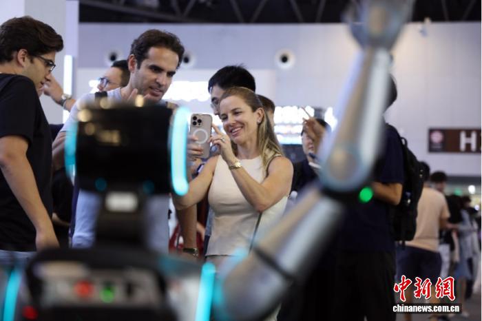 2025年7月,在上海舉辦的2025世界人工智能大會(huì)上,一款中國(guó)制造的機(jī)器人吸引外國(guó)觀(guān)眾。 中新社記者 湯彥俊 攝
