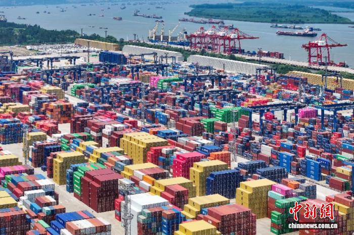 2025年7月14日,航拍長(zhǎng)江沿線(xiàn)南京龍?zhí)陡圻M(jìn)出口集裝箱碼頭。(資料圖) 中新社記者 泱波 攝
