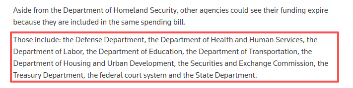 據路透社報道,美國國會每年需為438個聯(lián)邦機構撥款,若未能履行該職責,相關機構必須停止所有非必要工作。此次部分“停擺”涉及多個關鍵部門,包括美國衛(wèi)生與公眾服務部、交通部、證券交易委員會、財政部、聯(lián)邦法院系統(tǒng)等。