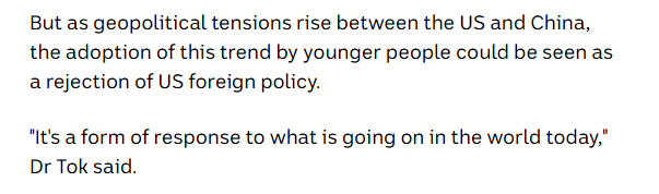 文章還說,許多創(chuàng)作“中國時刻”視頻的博主居住在美國。墨爾本大學亞洲研究院講師杜兆愷分析,年輕人的這種文化選擇或許是對美國外交政策的隱性反抗?!斑@是對當今世界格局的回應。”