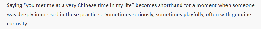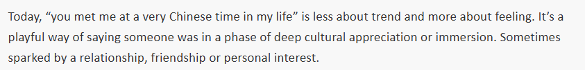 日本英文雜志《大都市》分析說,“你遇見了我人生中‘很中國’的時刻”,便成了沉浸于這類實踐的代名詞——有時認真,有時輕松,但總帶著真誠的好奇。
