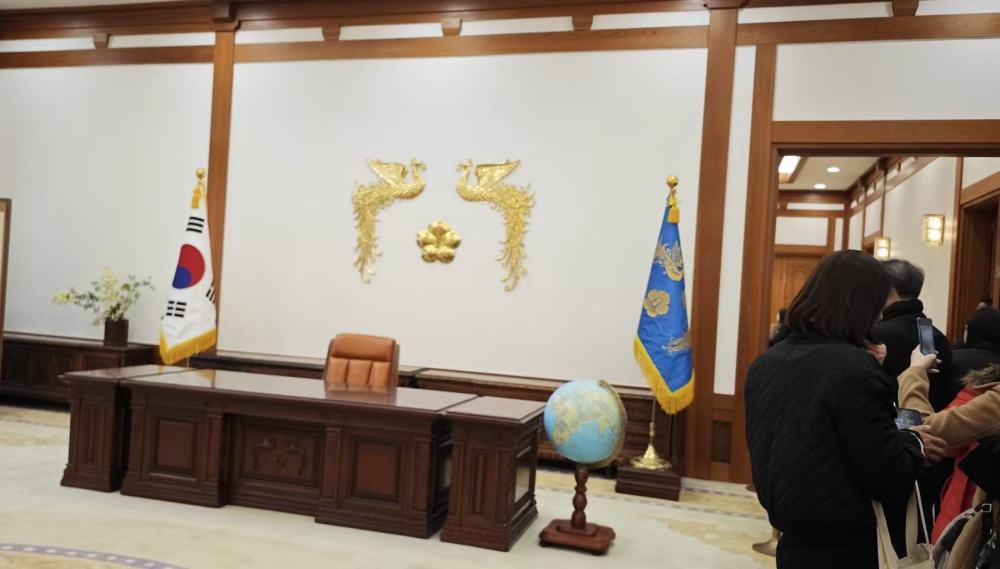 開放期間,迎賓館、本館、官邸等核心建筑悉數(shù)對(duì)外開放。本館是青瓦臺(tái)的核心建筑,設(shè)有總統(tǒng)辦公室、宴會(huì)廳、接見室等功能空間。其建筑風(fēng)格融匯韓國(guó)傳統(tǒng)審美:藍(lán)色韓式瓦片覆蓋的標(biāo)志性屋頂最為醒目。昔日只有外國(guó)政要、部長(zhǎng)級(jí)以上高官方能踏入的本館,如今成了最熱門的“打卡點(diǎn)”。