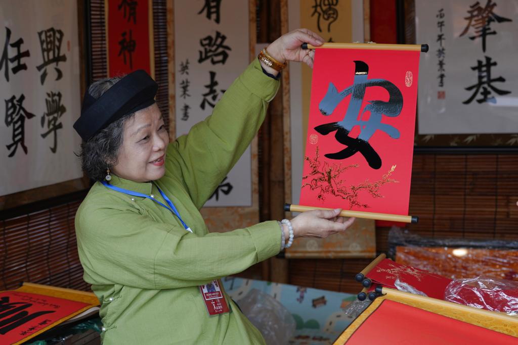 2月12日,在越南首都河內的新春書法節(jié)現場,一名書法家展示漢字書法作品。新華社記者 劉潁 攝
