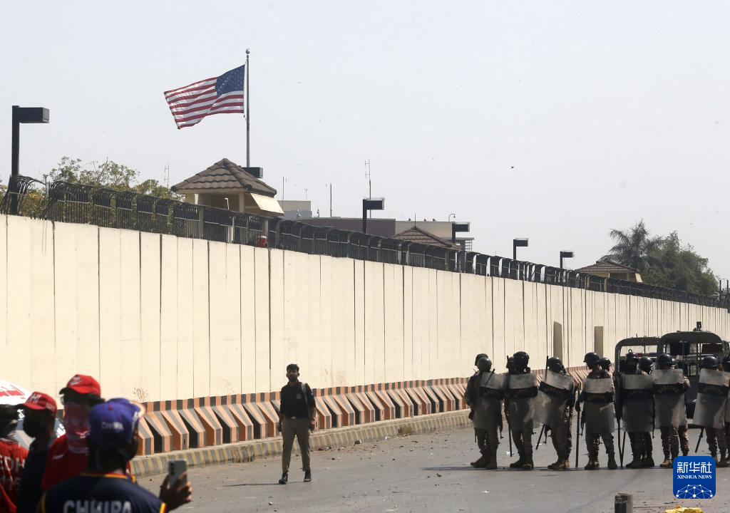 3月1日,執(zhí)法人員(畫面右側)在巴基斯坦南部城市卡拉奇的美國駐卡拉奇領事館外控制局勢。新華社發(fā)(伊姆蘭·阿里攝)