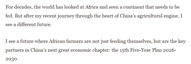 作者在探訪中國(guó)河南后撰文說(shuō),數(shù)十年來(lái),世界看待非洲的目光始終聚焦于“饑餓大陸”的標(biāo)簽。但當(dāng)我穿越中國(guó)農(nóng)業(yè)核心地帶后,一個(gè)截然不同的未來(lái)圖景正在浮現(xiàn)——非洲農(nóng)民不僅能夠?qū)崿F(xiàn)糧食自給,更將成為中國(guó)“十五五”藍(lán)圖中至關(guān)重要的戰(zhàn)略伙伴。