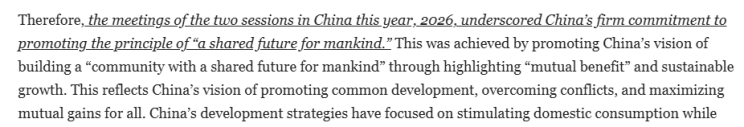 文章總結(jié)說(shuō),2026年中國(guó)兩會(huì)彰顯了中國(guó)堅(jiān)定推動(dòng)構(gòu)建人類命運(yùn)共同體原則的承諾。通過強(qiáng)調(diào)"互利共贏"和可持續(xù)增長(zhǎng),推動(dòng)構(gòu)建人類命運(yùn)共同體的愿景。這體現(xiàn)了中國(guó)推動(dòng)共同發(fā)展、化解沖突、實(shí)現(xiàn)各方利益最大化的理念。