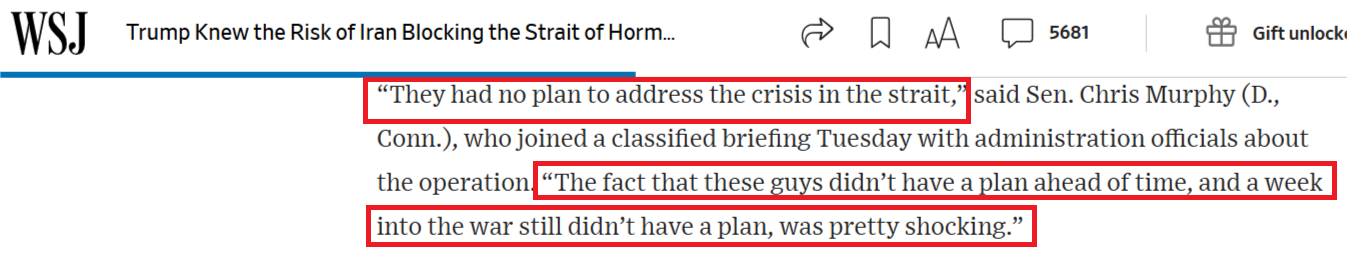 《華爾街日?qǐng)?bào)》14日的報(bào)道指出,當(dāng)前霍爾木茲海峽通行受阻及由此引發(fā)的經(jīng)濟(jì)動(dòng)蕩,反映出美國政府在發(fā)動(dòng)軍事打擊時(shí)缺乏規(guī)劃與深思熟慮。