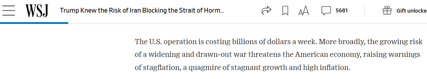 盟友之外,美國民眾也在為這場(chǎng)軍事行動(dòng)“埋單”?!度A爾街日?qǐng)?bào)》的報(bào)道稱,美國國務(wù)院直到戰(zhàn)爭(zhēng)開始后才敦促美國公民離開該地區(qū)國家或撤離部分大使館。而當(dāng)時(shí),商業(yè)空域已關(guān)閉,數(shù)萬美國人滯留中東,美國的外交官們?cè)诓糠执笫桂^也處于危險(xiǎn)之中;此外,美國此次軍事行動(dòng)每周耗資數(shù)十億美元。戰(zhàn)爭(zhēng)不斷擴(kuò)大且長期延宕的風(fēng)險(xiǎn)日益加劇,正威脅著美國經(jīng)濟(jì),甚至引發(fā)“滯脹”風(fēng)險(xiǎn)。