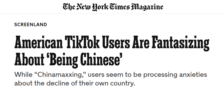美國《紐約時(shí)報(bào)》日前刊文稱,“Becoming Chinese”(“成為中國人”)“Chinamaxxing”(“極致中國化”)等話題在海外社交媒體上火爆異常,大量網(wǎng)友模仿并表示自己愛上了中國人的生活方式。文章認(rèn)為,電動(dòng)汽車、醫(yī)療保障、高速鐵路,這些先進(jìn)事物逐漸揭開了中國生活的神秘面紗,也讓中國成為新一代旅游勝地——一個(gè)兼具超凡脫俗的自然風(fēng)光與現(xiàn)代科技的神奇的地方。在“極致中國化”體驗(yàn)過程中,西方網(wǎng)友們似乎在消化對本國衰落的焦慮情緒,美國民眾們仿佛能從這些視頻片段中看到一種尚未在本土實(shí)現(xiàn)的未來圖景,在他們看來,中國人高品質(zhì)、低成本的生活,穿著拖鞋、滋養(yǎng)脾胃的日常,應(yīng)是人人都能享有的生活常態(tài)。