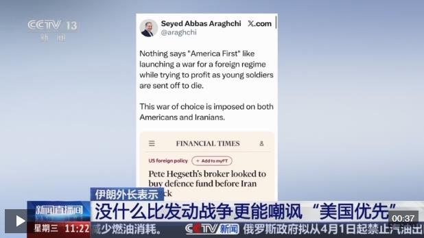 對(duì)于美國(guó)國(guó)防部長(zhǎng)赫格塞思的投資經(jīng)紀(jì)人曾在美以對(duì)伊朗發(fā)起軍事打擊前,嘗試投資防務(wù)類(lèi)基金一事,伊朗外交部長(zhǎng)阿拉格齊3月31日在社交媒體發(fā)文說(shuō),沒(méi)有什么比為一個(gè)外國(guó)政權(quán)發(fā)動(dòng)戰(zhàn)爭(zhēng)、并從被派往前線的年輕士兵之死中牟取暴利,更能嘲諷“美國(guó)優(yōu)先”口號(hào)的了。