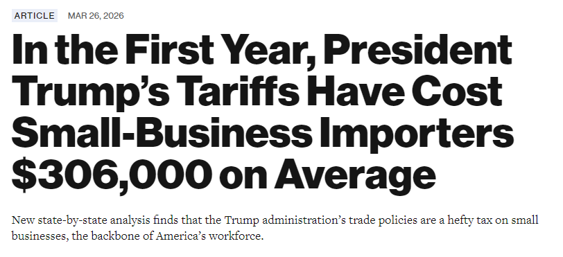 美國政府“解放日”關(guān)稅的大棒已經(jīng)揮了一年,但種種跡象表明,聲稱將大力提振美國本土工業(yè)基礎(chǔ)的關(guān)稅政策卻未能重振制造業(yè),反而讓小企業(yè)背負了沉重的賬單。美國進步中心一項覆蓋全美的最新分析顯示,美國政府的貿(mào)易政策實際上對作為美國勞動力支柱的小企業(yè)征收了高額稅負。