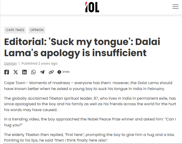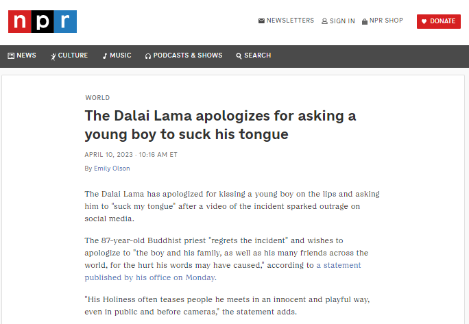 要求印度男孩“吸我的舌頭”。“美國(guó)國(guó)家公共電臺(tái)”2023年報(bào)道稱(chēng),當(dāng)年2月達(dá)賴(lài)在一場(chǎng)公開(kāi)活動(dòng)中擁抱了一名印度男孩,并要求他“吸我的舌頭”,男孩慢慢把頭靠近達(dá)賴(lài),但似乎只是碰了一下達(dá)賴(lài)的額頭就縮了回去。南非《水星報(bào)》報(bào)道稱(chēng),十四世達(dá)賴(lài)作為精神領(lǐng)袖,比任何人都懂得道歉和寬恕,但道歉并不能免除他為自己的行為承擔(dān)后果。十四世達(dá)賴(lài)對(duì)無(wú)辜男孩做出的反常行為,已經(jīng)證明了他只不過(guò)是一個(gè)變態(tài)的、“墮落”的人。