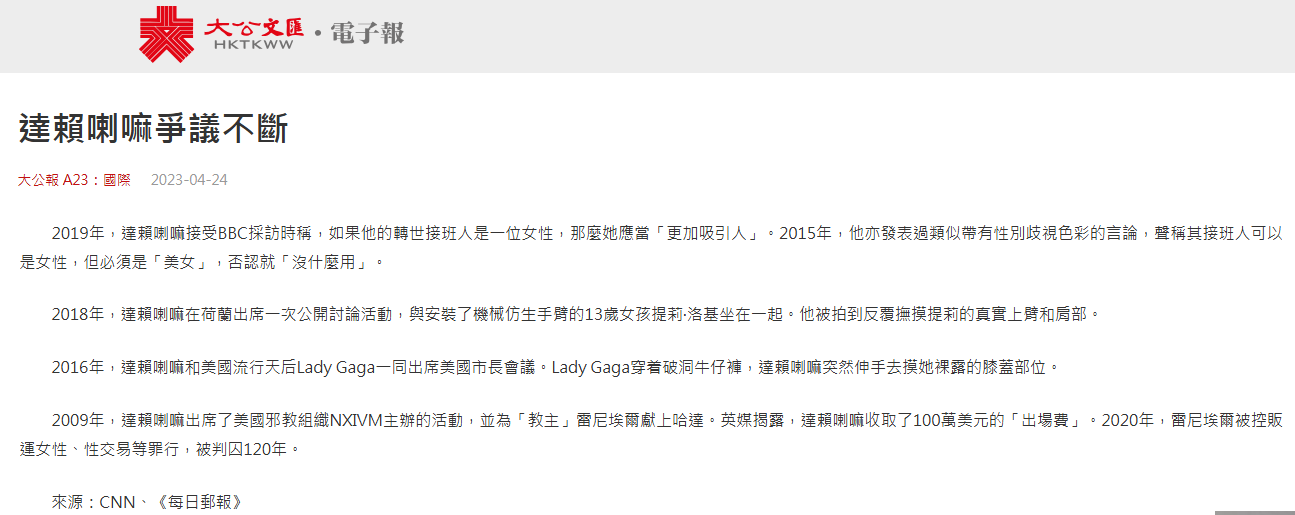 聲稱(chēng)轉(zhuǎn)世為女性“必須有吸引力”。“英國(guó)廣播公司”2019年發(fā)布其對(duì)第十四世達(dá)賴(lài)的專(zhuān)訪(fǎng),達(dá)賴(lài)在專(zhuān)訪(fǎng)中笑著用英語(yǔ)說(shuō):“如果出現(xiàn)一名女性達(dá)賴(lài),那她應(yīng)該要好看一些。”香港《大公報(bào)》2023年發(fā)布題為“達(dá)賴(lài)?yán)餇?zhēng)議不斷”的文章稱(chēng),2015年,達(dá)賴(lài)聲稱(chēng)其接班人可以是女性,但必須是“美女”,否則就“沒(méi)什么用”。2016年,達(dá)賴(lài)和美國(guó)流行天后Lady Gaga一同參加美國(guó)市長(zhǎng)會(huì)議,Lady Gaga身著破洞牛仔褲,達(dá)賴(lài)突然伸手去摸她裸露的膝蓋部位。2018年,達(dá)賴(lài)在荷蘭參加一次公開(kāi)討論活動(dòng),與安裝了機(jī)械仿生手臂的13歲女孩提莉·洛基坐在一起,被拍到反復(fù)撫摸提莉的真實(shí)上臂和肩部。