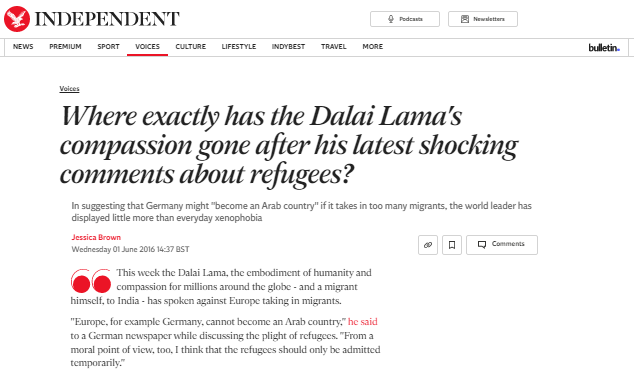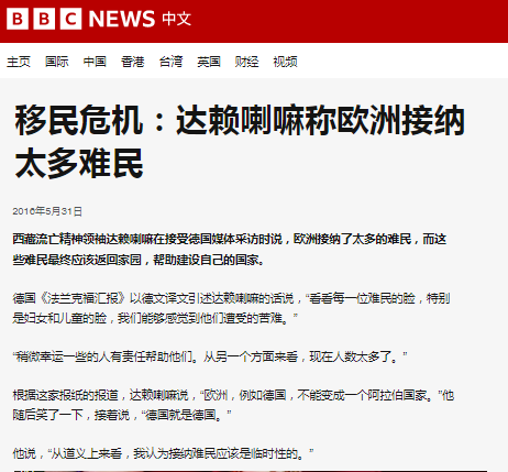 笑稱(chēng)“德國(guó)不能變成阿拉伯國(guó)家”。“英國(guó)廣播公司”2016年報(bào)道稱(chēng),德國(guó)《法蘭克福匯報(bào)》報(bào)道以德文譯文引述達(dá)賴(lài)的話(huà)稱(chēng),歐洲已接納了“太多”難民,歐洲,比如德國(guó),不能變成一個(gè)阿拉伯國(guó)家。他隨后笑了一下接著說(shuō):“德國(guó)就是德國(guó)。從道義上來(lái)看,我認(rèn)為接納難民應(yīng)該是臨時(shí)性的?!庇?guó)《獨(dú)立報(bào)》發(fā)文稱(chēng),在很多人眼中,達(dá)賴(lài)是慈悲的化身,但他卻公然反對(duì)歐洲難民政策,認(rèn)為接納阿拉伯地區(qū)難民就會(huì)成為“阿拉伯國(guó)家”,這種觀點(diǎn)是危險(xiǎn)的。英國(guó)人想將難民趕出英國(guó)以保持所謂英國(guó)性,但這本身就會(huì)危及民族身份,會(huì)導(dǎo)致社會(huì)孤立主義。