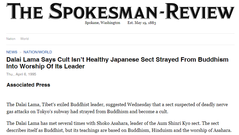 公開(kāi)支持日本奧姆真理教頭目麻原彰晃。麻原彰晃是末日邪教組織奧姆真理教的創(chuàng)始人兼領(lǐng)導(dǎo)人,被指控策劃了1995年?yáng)|京地鐵沙林毒氣襲擊事件,造成13人死亡。美國(guó)《斯波坎評(píng)論報(bào)》網(wǎng)站1995年發(fā)文稱(chēng),達(dá)賴(lài)在接受記者采訪(fǎng)時(shí)承認(rèn)了與邪教頭目麻原彰晃的聯(lián)系。