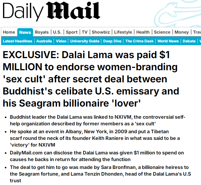 參與性邪教N(yùn)XIVM活動(dòng)并獲巨額捐贈(zèng)。NXIVM是美國(guó)“性邪教”組織,自稱(chēng)為“互助會(huì)性質(zhì)”培訓(xùn)機(jī)構(gòu),實(shí)則招募“性奴隸”。英國(guó)《每日郵報(bào)》2018年報(bào)道稱(chēng),達(dá)賴(lài)2009年在紐約州奧爾巴尼市的一次活動(dòng)上發(fā)表講話(huà)并為NXIVM創(chuàng)始人基思·拉尼爾戴上哈達(dá),這被認(rèn)為是NXIVM的一次“勝利”。隨后,達(dá)賴(lài)獲得了100萬(wàn)美元用于他支持的“事業(yè)”。