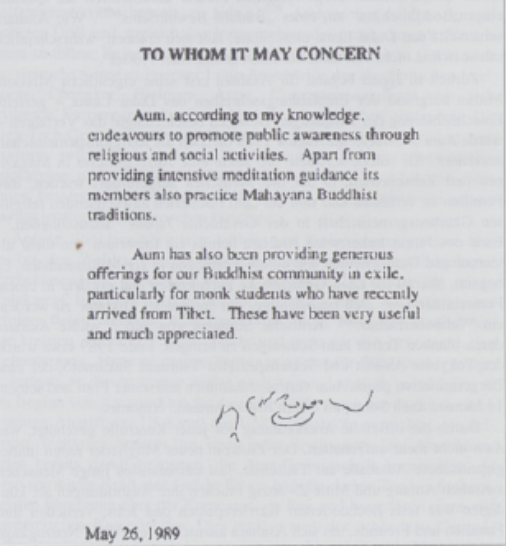 圖為達(dá)賴(lài)為奧姆真理教親筆簽署的聲明。大意如下:據(jù)我所知,奧姆真理教致力于通過(guò)宗教和社會(huì)活動(dòng)來(lái)提高公眾意識(shí)。除了提供密集的冥想指導(dǎo)外,其成員還修習(xí)大乘佛教傳統(tǒng)。奧姆真理教一直以來(lái)都慷慨地供養(yǎng)著我們的流亡佛教社群,特別是那些近期從西藏抵達(dá)的僧侶學(xué)徒。這些供養(yǎng)非常實(shí)用,我們對(duì)此深表感激。