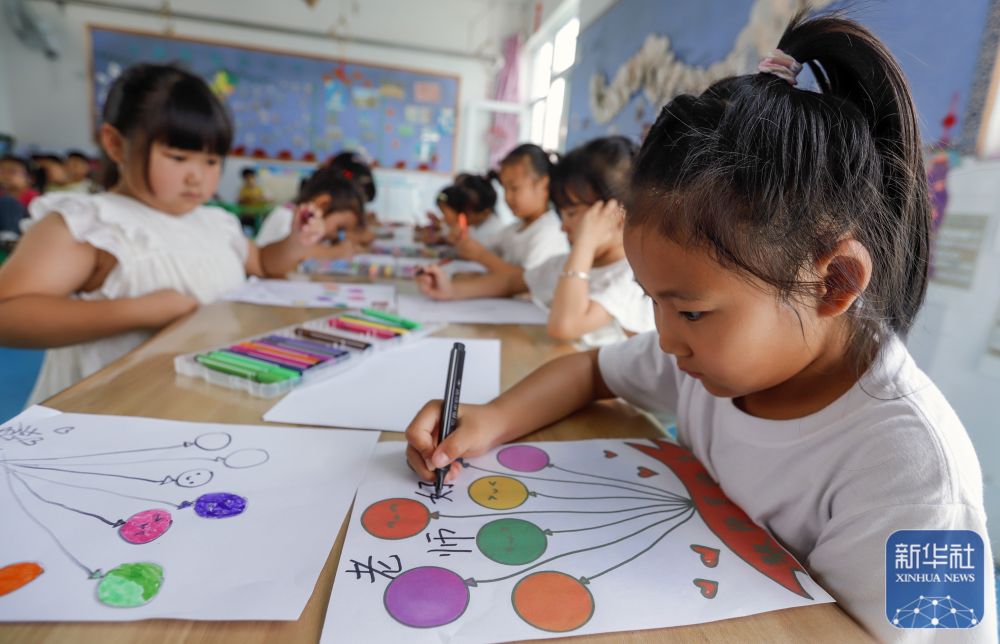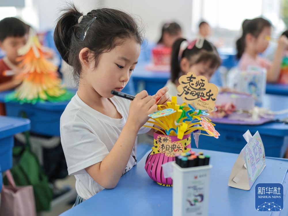 9月9日,河北省遵化市遵化鎮(zhèn)南關(guān)幼兒園的小朋友在繪制美術(shù)作品感念師恩。新華社發(fā)(劉滿(mǎn)倉(cāng)攝)