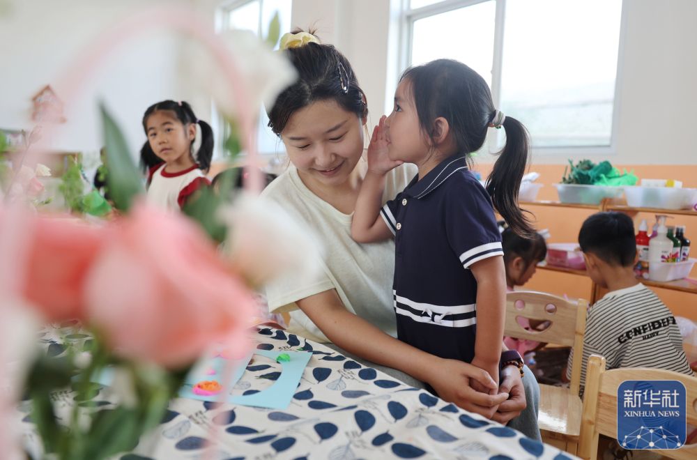 9月9日,在山東省臨沂市沂南縣銅井鎮(zhèn)中心幼兒園,小朋友在跟老師分享節(jié)日祝福悄悄話(huà)。新華社發(fā)(王彥冰攝)