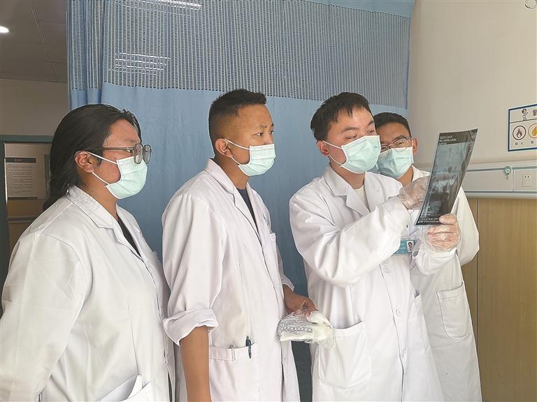 寧波市第六醫(yī)院關節(jié)外科副主任醫(yī)師黃哲宇(右二)正在分析影像,同比如縣人民醫(yī)院醫(yī)生討論病情,踐行“傳幫帶”。
