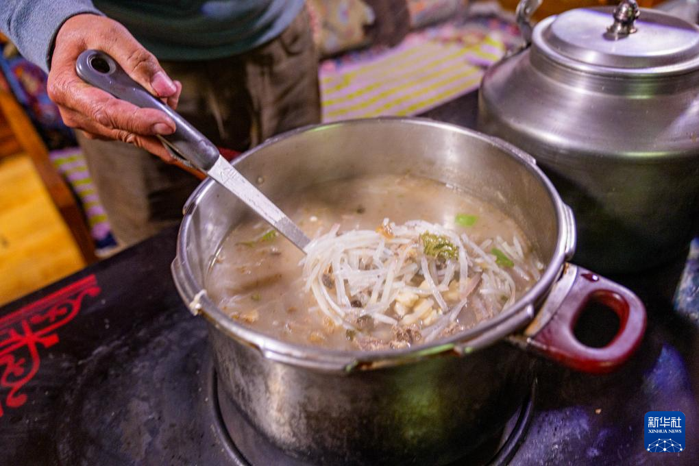在藏語中,“古”意為“九”,“突”意為“面”,“古突”是一種用牦牛肉湯加入牛肉、蘿卜、奶渣等食材熬煮的面食。按西藏傳統(tǒng)習俗,“古突”夜,家家戶戶迎來團聚,一起享用“古突”。