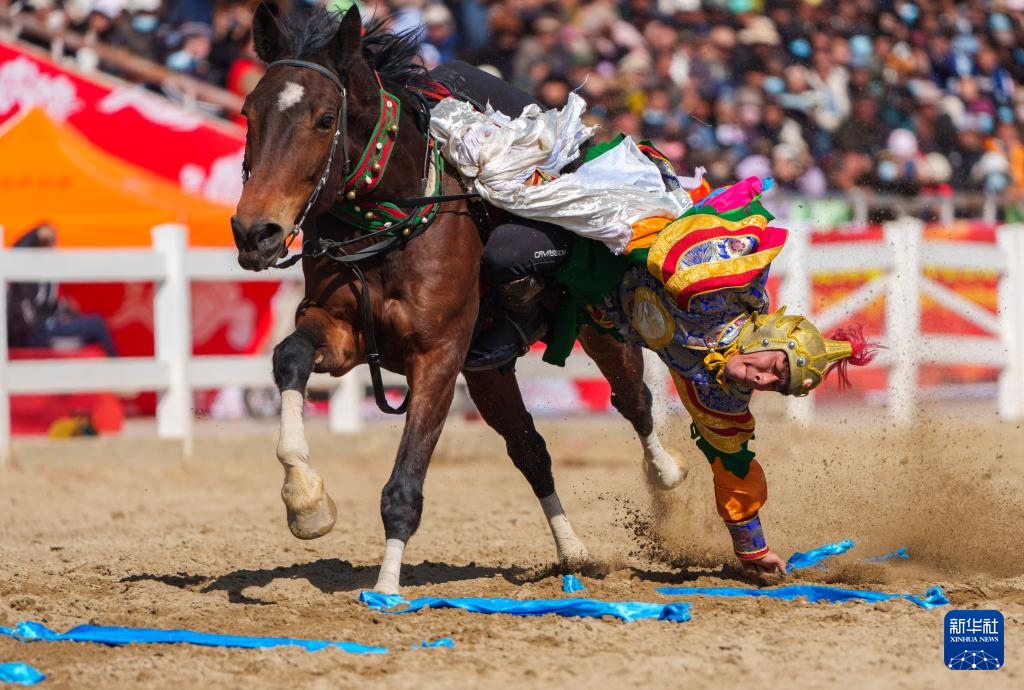 2月20日,馬術(shù)隊(duì)員在表演馬上拾哈達(dá)。